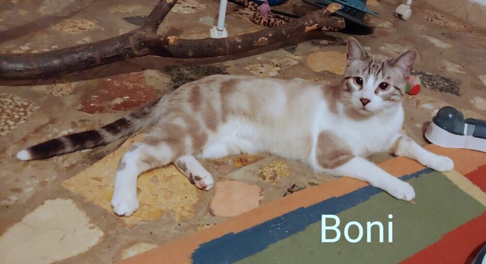 Boni bewegt sich frei in der Wohnung, genießt das weiche  Sofa und zeigt keine Angst. Aber er weicht noch der Hand aus. Er hat Angst vor Berührung! Mit Geduld und Ruhe muss man ihm zeigen, dass eine Hand zum Streicheln da ist. Mit Artgenossen ist er sehr verträglich und ein Kavalier!