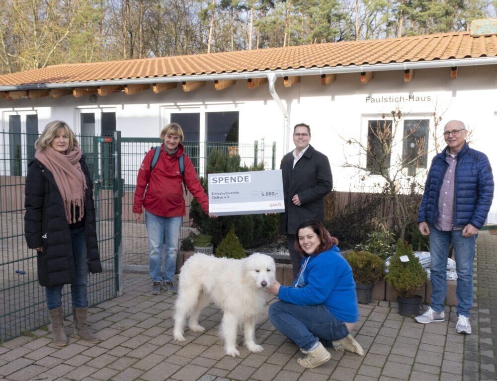 Genau an dieser Stelle kommen die Stadtwerke Gießen (SWG) ins Spiel. Traditionell verzichtet das Unternehmen auf Weihnachtsgeschenke für Geschäftspartner. Das auf diesem Wege eingesparte Geld – konkret 5000 Euro – lassen die SWG gemeinnützigen Organisationen oder Einrichtungen in der Region zukommen. In diesem Jahr fiel die Wahl auf das Tierheim Gießen beziehungsweise dessen Träger, den Tierschutzverein Gießen und Umgebung e. V. (TSV Gießen). „Die Mitarbeiterinnen und Mitarbeiter des Tierheims leisten wertvolle Arbeit für unsere Region. Dieses Engagement möchten wir unterstützen“, erklärt SWG-Unternehmenssprecher Ulli Boos anlässlich der Scheckübergabe am 10. Januar auf dem Gelände des Tierheims Gießen.