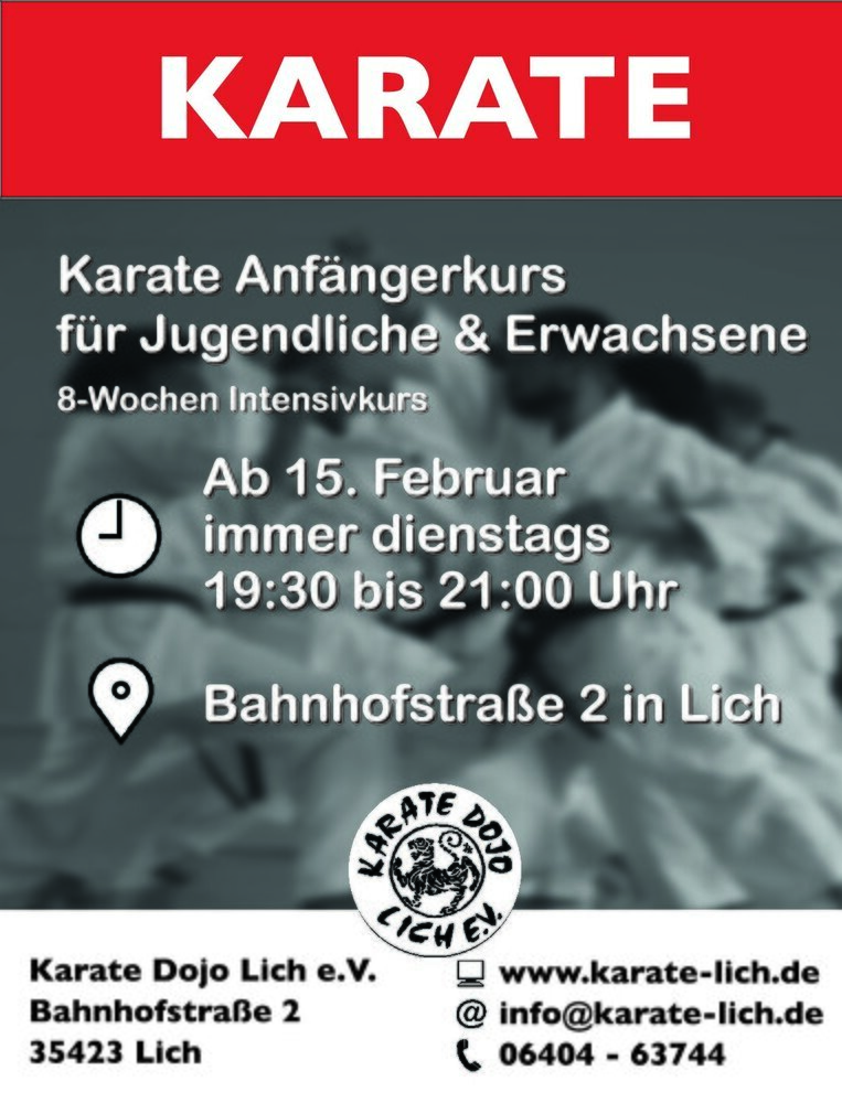 Das Karate Dojo Lich e. V. bietet Neu- und Wiedereinsteigern die Möglichkeit acht Wochen lang die faszinierende japanische Sportart auszuprobieren. Karate fördert neben Ausdauer, Kraft und Beweglichkeit vor allem koordinative Fähigkeiten, die im klassischen Fitnesstraining oftmals zu kurz kommen und eignet sich für nahezu jeden Altersbereich. Ein achtwöchiger Kurs für Erwachsene und Jugendliche startet am Dienstag, den 15. Februar 2022. Er vermittelt die Grundlagen der japanischen Kampfkunst und ermöglicht den anschließenden Einstieg in eine fortlaufende Gruppe. Auch Wiedereinsteiger, die vielleicht vor vielen Jahren schon einmal Karate oder eine andere Kampfsportart ausgeübt haben, sind herzlich willkommen. Trainiert wird dienstags ab 19:30 Uhr in einfacher Sportkleidung und barfuß in der Halle des Karate Dojo in der Bahnhofstraße 2 in Lich. Das Training findet selbstverständlich unter Beachtung der geltenden Corona-Verordnungen statt, daher wird auch um vorherige Anmeldung gebeten. Infos gibt es vormittags in der Geschäftsstelle, unter 06404-63744 oder unter der E-Mail-Adresse info@karate-lich.de.