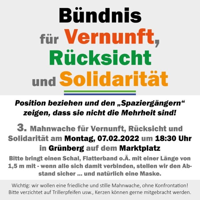 Das Grünberger Bündnis für Vernunft, Rücksicht und Solidarität hat an den vergangenen zwei Montagen bereits eine friedliche und breit von der Bevölkerung unterstützte Mahnwache abgehalten. Am kommenden Montag, den 07.02.2022 geht es in die dritte „Runde“ der Mahnwache, wie das Organisationsteam bereits am Montag an der Veranstaltung mitteilte.