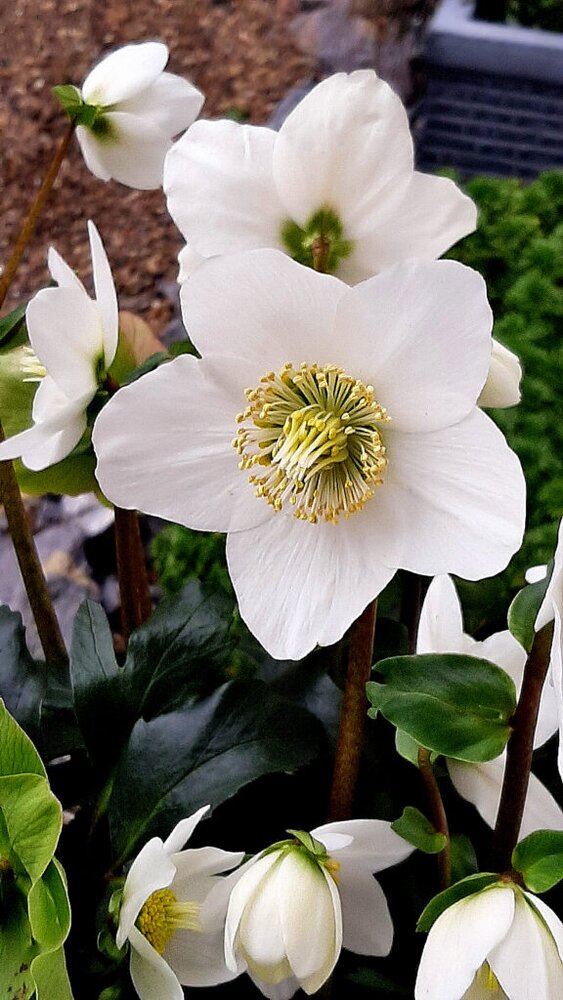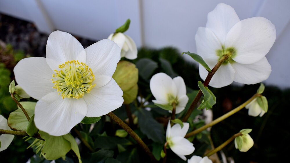 Christrosen (Helleborus niger) sind eine echte Besonderheit im Garten. Wenn alle anderen Pflanzen im Winterschlaf liegen, öffnen sie ihre zauberhaften weißen Blüten. Zur Weihnachtszeit standen sie bereits in voller Blüte, das besagt, dass es sich hier um eine frühe Sorte handelt. Die Gartenstauden sind bei richtiger Behandlung äußerst langlebig.
