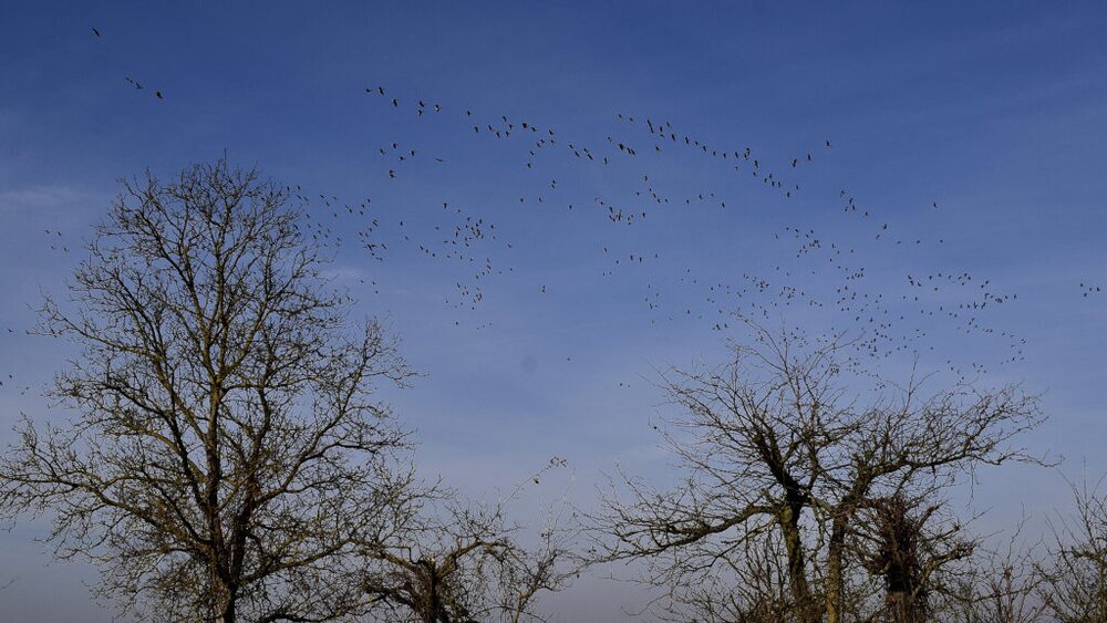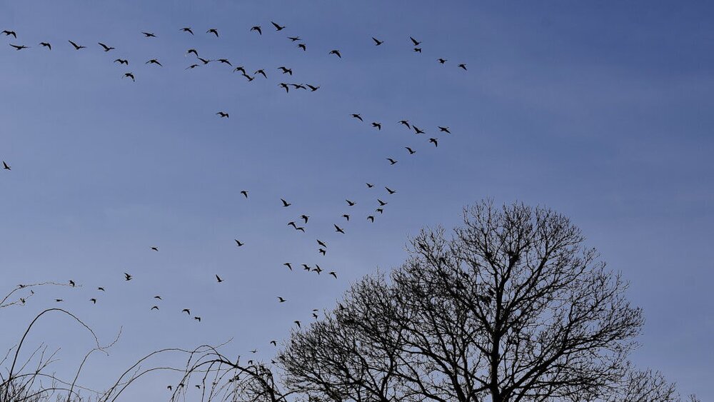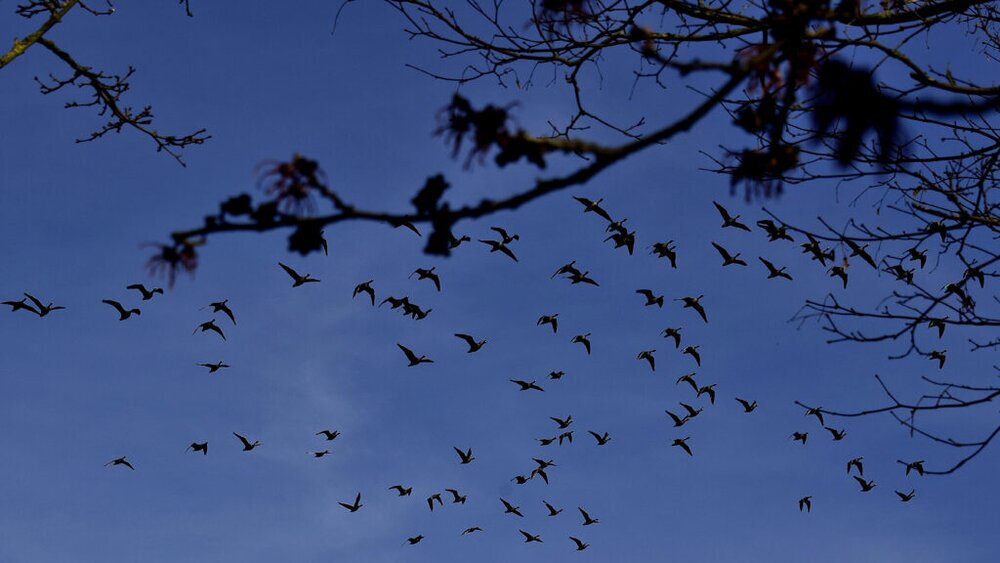 Ein Schwarm Wildgänse (wohl Graugänse) unterwegs.
