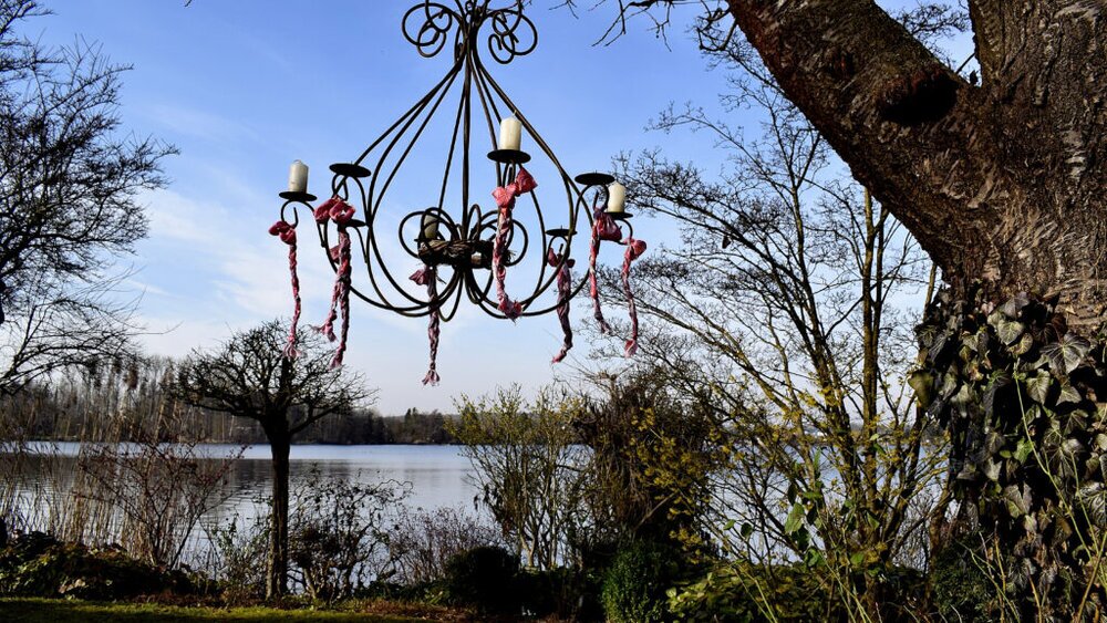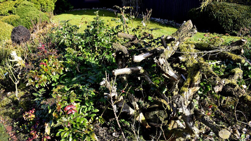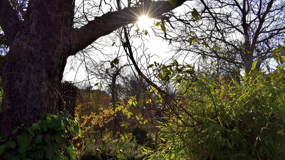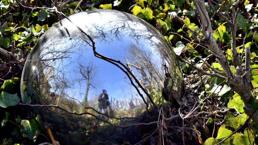 Spieglein, Spieglein an der W. … – hier am Apfelbaumstamm. `Geschmackvoll`: Das Gartendeko im Kunstgarten von Dr. Biester.