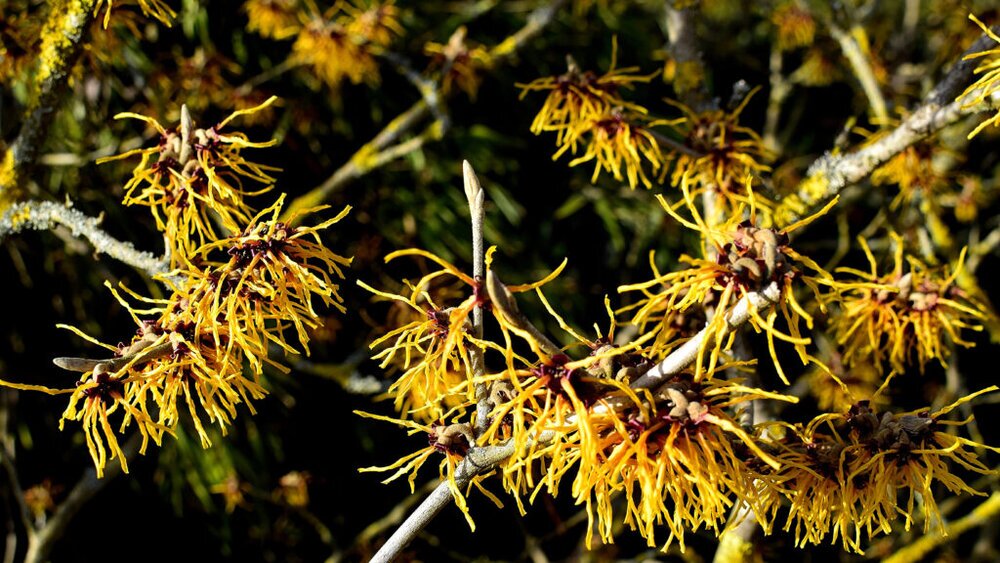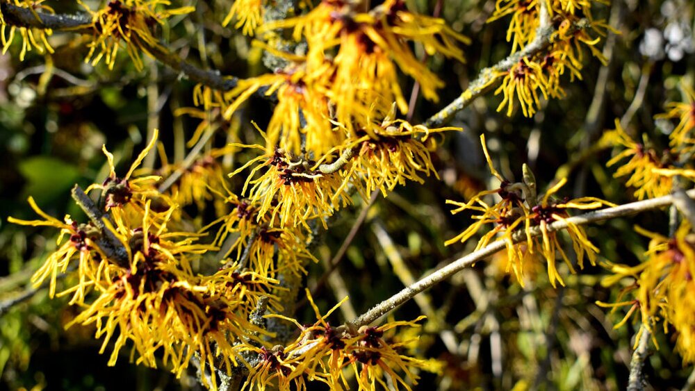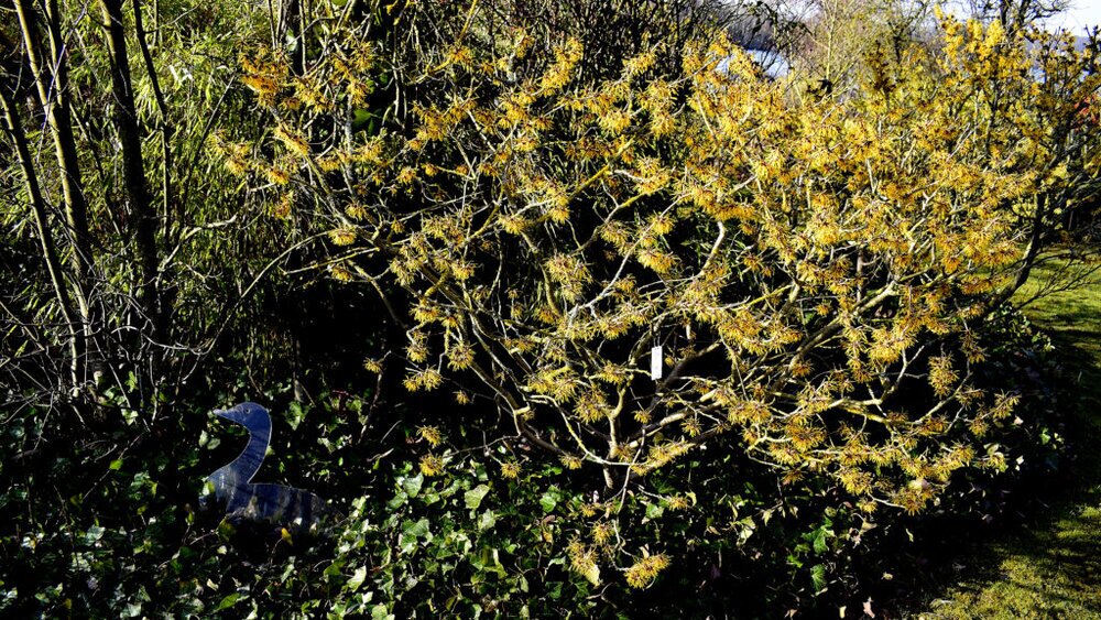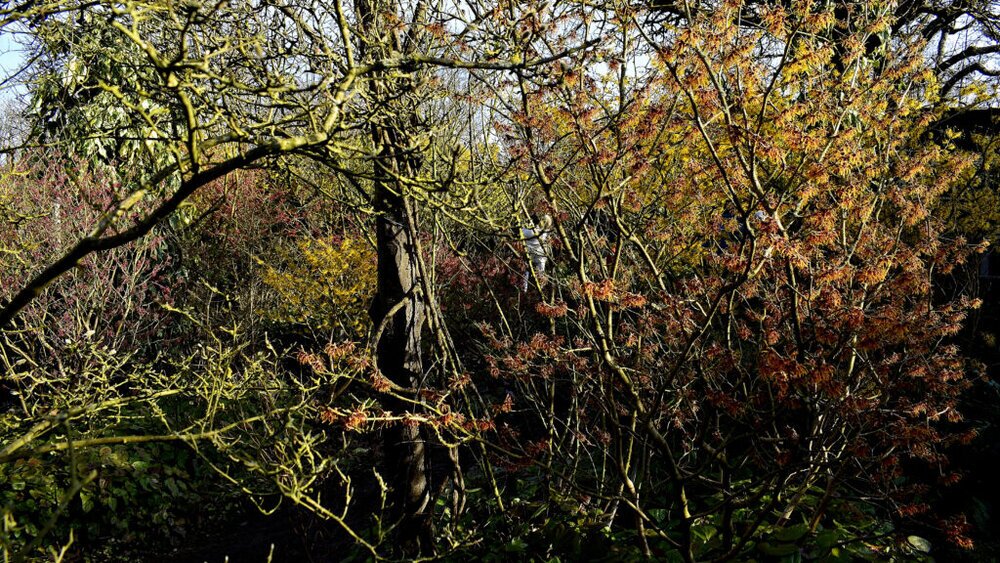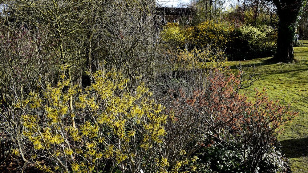 Schon gleich der erste Anblick wußte wieder zu begeistern. Auf dem rund 3.ooo Quadratmeter großen Areal, unmittelbar am Trais-Horloffer See gelegen, strahlen blühende Zaubernuss-Sträucher nur so um die Wette – in Rot, Orange, Gelb, Blaurot, in allen Farbnuancen und Blütenformen. Das geht eigentlich schon eine ganze Weile so. Bereits seit Dezember überraschen etliche der insgesamt 105 verschiedenen Sorten quasi im >fliegenden Wechsel!< – und wenn alles gut geht, dauert das bis in den März hinein. Die drei bis 40 Jahre alten und bis zu sechs Meter hohen Sträucher blühen zu unterschiedlichen Zeiten. Bei Kälte kann das bis zu sechs Wochen sein, bei steigenden Temperaturen, – wie wir sie derzeit haben (Wo bleibt der Winter!) – ist das manchmal auch nur drei Wochen lang der Fall.