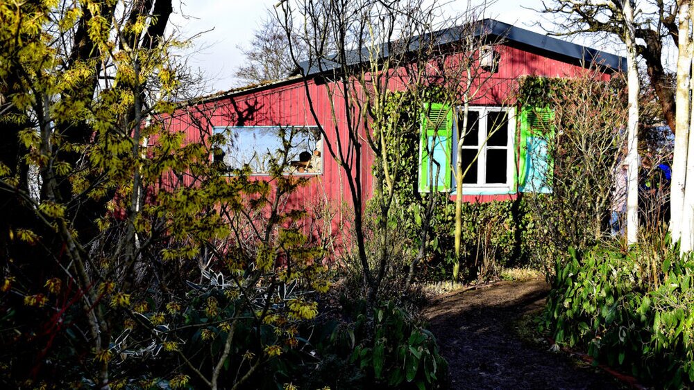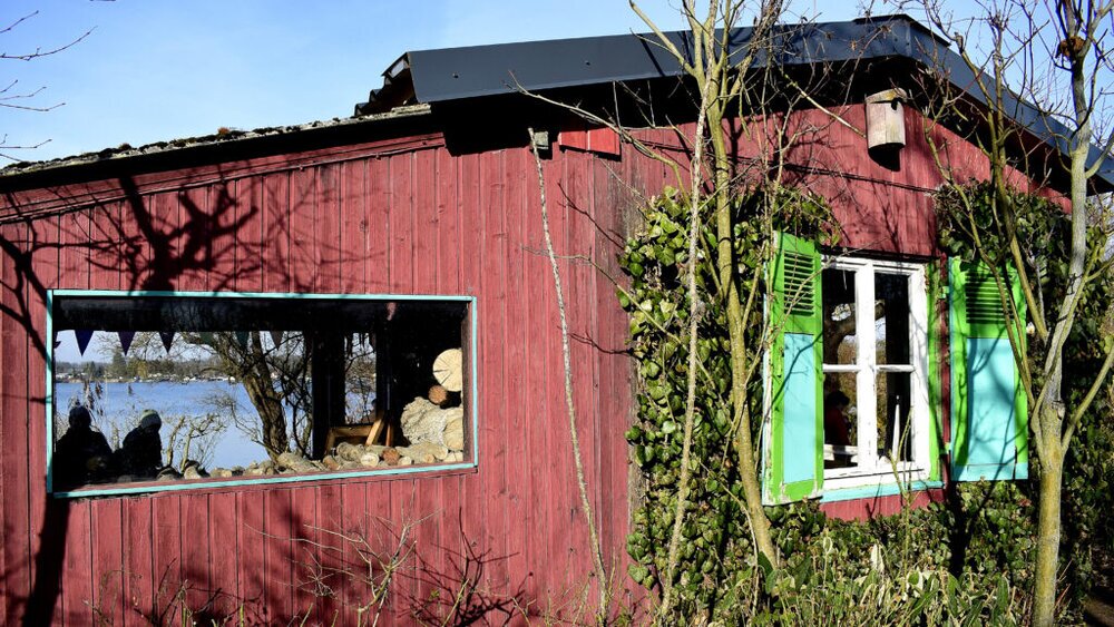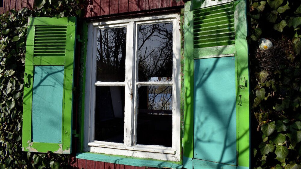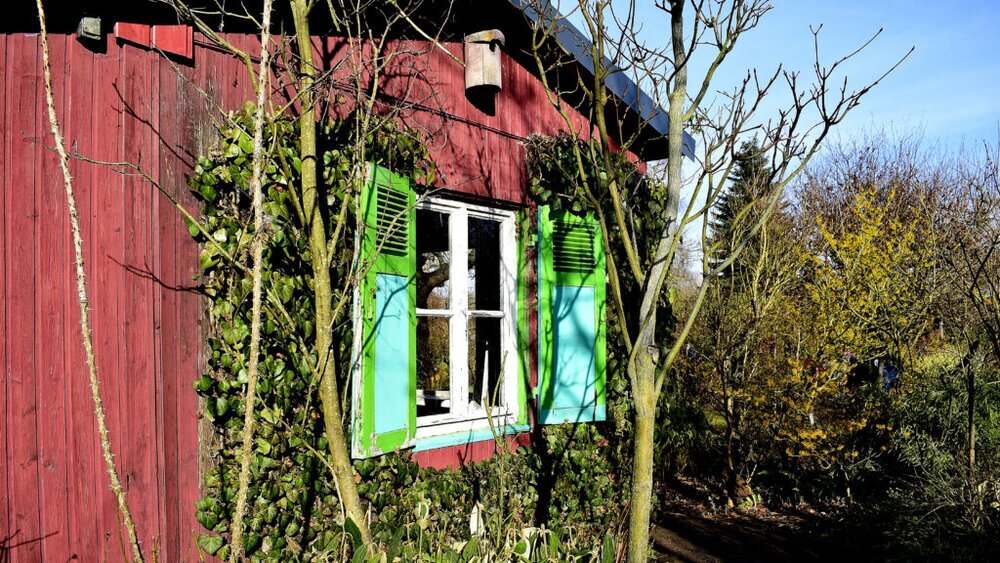 Wunderschön anzusehen, das Gartenhaus in Norwegerfarbe mit den alten Klappläden.