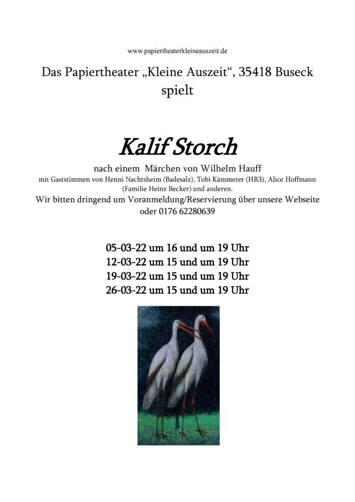 Am vergangenen Samstag, 05.03.22 war es endlich soweit. Susanne und Stefan Schweig luden zu zwei Vorstellungen in ihrem neuen Papiertheater „kleine Auszeit“ ein. Zu sehen gab es „Kalif Storch“. Die Resonanz war überwältigend. Sie blickten nach den Vorführungen in zufriedene Gesichter und auch der andauernde Applaus bezeugte dies.