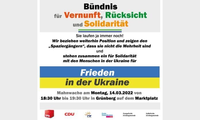 Hierfür ruft das Bündnis wieder für kommenden Montag, den 14.03.2022, ab 18:30 Uhr bis 19:30 Uhr in Grünberg auf dem Marktplatz eine Mahnwache aus und bittet die Bevölkerung um rege Teilnahme.