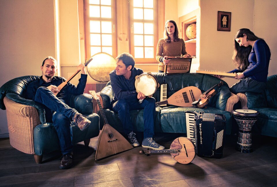 Vier Musiker, mehr als fünfzehn Musikinstrumente und Lieder aus zwanzig verschiedenen Ländern in einem Konzert? Klingt beeindruckend und genauso wirkt es auf das Publikum. Allein der Bandgründer Markus Wach wechselt zwischen mehr als acht Zupf- und Streichinstrumenten am Abend. Die meisten von ihnen sind alt und exotisch, teilweise antik und selbst restauriert. Einige der Instrumente klingen so außergewöhnlich, dass man den Zuhörern das Staunen am Gesicht ablesen kann: zum Beispiel, wenn der Musiker die afghanische Laute Rubab mit zwanzig Saiten nimmt und ein bewegendes Intro darauf improvisiert. Die Geigerin Daria Khoroshilova spielt manche Stücke auf dem orientalischen Geigenvorfahren Rebec, dessen besonderer Klang den Melodien einen authentischen Charakter verleiht. Lena Heinrich bereichert die Musik gefühlvoll auf dem Akkordeon oder mit den Borduntönen der indischen Shrutibox. Auf unterschiedlichsten Perkussioninstrumenten legt Moritz Weissinger ein rhythmisches Fundament, mal ganz fein auf der Doumbek, mal ziemlich vordergründig auf der iranischen Trommel Daf. Perlende Melodien und fesselnde Rhythmen gleiten von einem Instrument zum anderen, verflechten sich mit Improvisationen und erschaffen ein wunderbares Hörerlebnis.