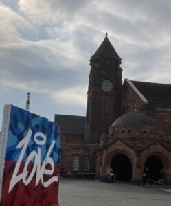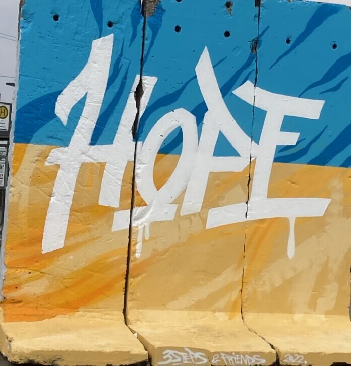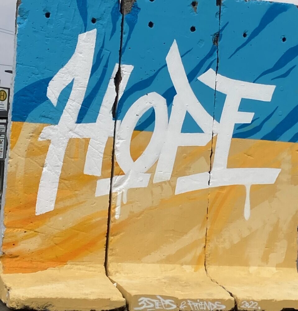 Das Stück der Berliner Mauer auf dem Bahnhofsvorplatz in Gießen haben die Künstler der 3Steps-Gruppe mit ihrer Botschaft zum Ukraine-Krieg gestaltet: Frieden, Hoffnung und Liebe für die Menschen in Russland, der Ukraine und der ganzen Welt. Ein starkes Zeichen.
