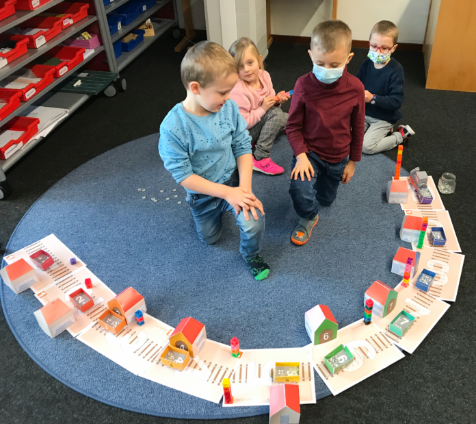 Familien wählen das Vorschulkonzept bewusst, um schon vor dem offiziellen Schulstart ein strukturiertes Lernangebot zu nutzen. Ein Besuch bei den „Raupen“ zeigt, wie ernst die Fünf- bis Sechsjährigen ihren Vorschulbesuch nehmen. Nachdem im Sitzkreis Mathe- und Deutsch-Spiele vorgestellt wurden, können sich die Kinder aussuchen, mit welchem Fach sie starten möchten. Hoch im Kurs stehen die Lese-Lern-Hefte: „Ich möchte im Küken-Heft weiterarbeiten“, ruft Freya und schaut dabei ihre Zwillingsschwester Greta und ihre neue Freundin Nele an, die sie in der Vorschulklasse kennengelernt hat. Die Kinder stürmen los, um ihre Arbeitshefte herauszuholen und mit der Arbeit zu beginnen.