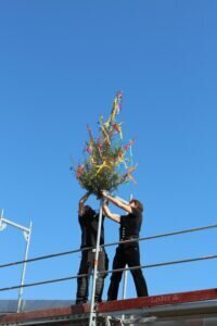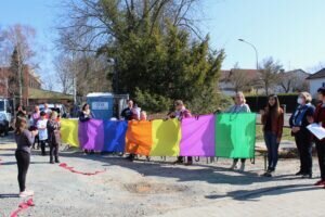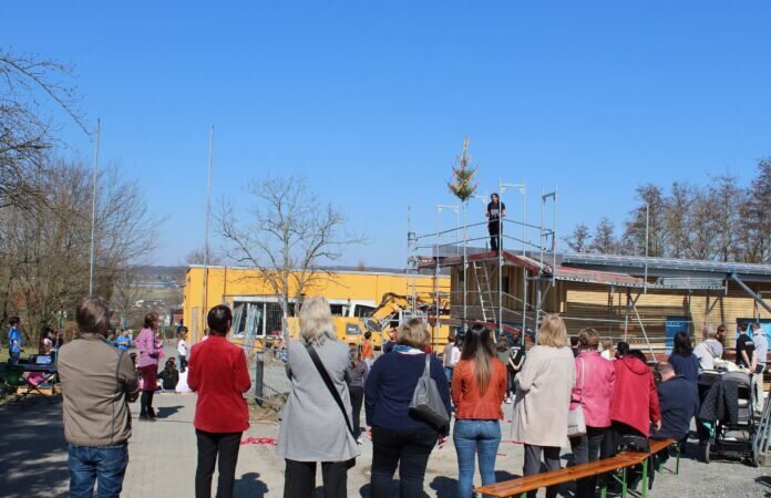 Zum Richtfest trafen sich alle Schülerinnen und Schüler der Hedwig-Burgheim-Schule in Rödgen mit ihren Lehrkräften am Neubau der neuen Mensa. Neben Vertretern der Stadt Gießen und des Ortsbeirats Rödgen waren natürlich auch die Handwerker zugegen. Gemeinsam wollte man dieses besondere Ereignis feiern. Die Kinder hatten hierfür verschiedene musikalische Beiträge einstudiert und führten diese stolz vor. Stadträtin Astrid Eibelshäuser nannte die Fakten: Da die einzügige Grundschule in Rödgen über keine Mensa verfügte und die Situation beim Mittagessen dadurch sehr schwierig war, entschloss man sich, einen Mensa-Neubau zu planen. Dieser Raum wird Platz für ca. 50 Schülerinnen und Schüler bieten, daneben gibt es noch einen Ruheraum und eine barrierefreie Toilette. Der Mensabau hat eine Gesamtfläche von ca. 200 Quadratmetern und einen umbauten Raum von ca. 820 Quadratmetern. Für die Gesamtmaßnahme sind derzeit 650.000,00 € vorgesehen. Um einen nachhaltigen Neubau zu realisieren, wird das eingeschossige Gebäude in Holzrahmenbauweise errichtet. Das Dach wird mit einer Photovoltaikanlage ausgestattet, die den Energiebedarf der gesamten Schule abdecken wird. Zwischen den Gebäuden wird ein Schulgarten angelegt. Passend dazu hat der Förderverein zu einem Malwettbewerb aufgerufen, bei dem die Kinder ihre Ideen darstellen können. Die Siegerbilder sollen dann in der neuen Mensa ausgestellt werden. Schulleiterin Nina Schäfer hatte eine Zeitkapsel dabei, die mit Texten der Schülerinnen und Schüler, mit einer Maske und einem Schnelltest und den Zeitungsartikeln zum Richtfest bestückt in das Gebäude eingefügt werden soll. Sie freue sich sehr darauf, mit den Kindern in das neue Gebäude einziehen zu können. Rödgens Ortsvorsteherin Elke Victor überbrachte gute Wünsche und hatte ein Geschenk für die Schule dabei: Ein Pausenspielgerät zur Förderung der Teamfähigkeit und Koordination. Schließlich wurde ein von den Schülerinnen und Schülern geschmückter Baum von den Zimmermännern am neuen Dachstuhl befestigt und der traditionelle Richtspruch verlesen.