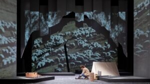 Was die Zuschauer sofort beeindruckt, ist das fantastische Bühnenbild von Lukas Noll mit Videos von Marc Jungreithmeier. Mit beweglichen Wänden und Lichttechnik wird quasi ein 3D-Ambiente rekonstruiert. Die Berge erhöhen sich tief im Hinte
