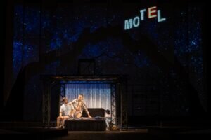 rgrund und erlauben auch, dass die Protagonisten hochklettern. Durch Projektionen taucht das Publikum in einer Berglandschaft mit Schneefall, grünen Wiesen mit Schafen, Flüssen und Abendstimmung mit Mond und Sternen ein. Auch die Innenräume, wie die Wohnungen, das Motelzimmer und die Landwirtschaftsmaschinenfirma, die nur mit wenigen Gegenständen eingerichtet sind, werden mit zahlreichen animierten Details durch Videos bereichert.