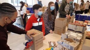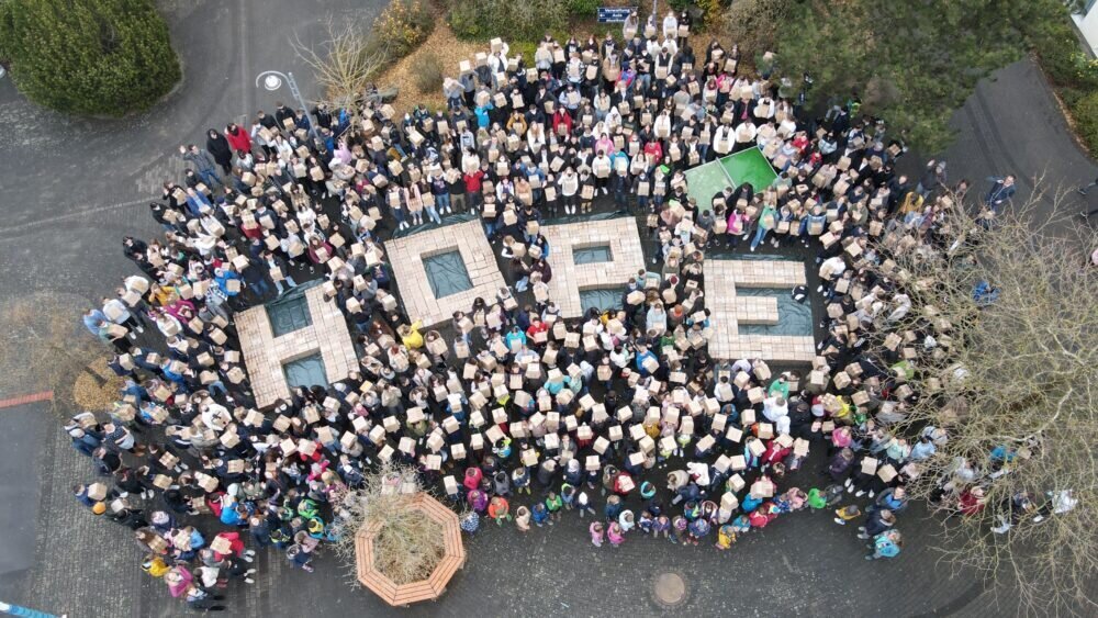 An der August-Hermann-Francke-Schule wurden die Pakete für ukrainische Flüchtlinge, welche an der rumänischen oder moldawischen Grenze untergekommen sind, unter Mitwirkung der gesamten Schulgemeinde an zuverlässige Kontaktpersonen des Vereins „Zisterne“ übergeben. Vorher versammelten sich all die Kinder und Jugendlichen, die so fleißig Lebensmittelpakete gepackt und mit Grußkarten versehen hatten, zwischen Basketballfeld und Tischtennisplatte auf dem Weg zum Lkw. Rund um den englischen Schriftzug „Hope“ (Hoffnung; gebildet aus Kartons) hielten Grundschüler und Schüler der weiterführenden Schule inne, um sich von einer Drohne aufnehmen zu lassen, bevor alle 1205 Kartons in zwei Lastwagen verladen wurden. So viele Zeichen der Solidarität konnten innerhalb von vier Wochen dank der großen Beteiligung entstehen, da teilweise auch in den Familien mutmachende Texte verfasst, Bilder gemalt und Grundnahrungsmittel eingepackt wurden.