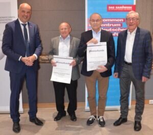 Den erfolgreichen Absolventen gratulierte in einer kurzen Laudatio der Präsident der Handwerkskammer (HWK) Wiesbaden, Stefan Füll, sowie der Innungsobermeister Erich Klotz aus Pohlheim, zusammen mit dem Geschäftsführer der Kreishandwerkerschaft des Wetteraukreises, Matthias Fritzel und Vertretern der Max-Eyth-Schule Alsfeld und der Erasmus-Kittler-Schule Darmstadt.