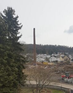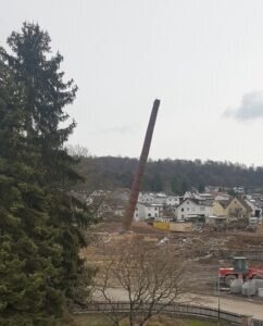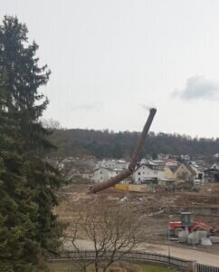 Etliche Londorfer wollten dabei sein, wenn der Schornstein von Wissners Sägewerk zu Boden fällt. Viele Interessenten waren als Zaungäste- mit dem nötigen Abstand, versteht sich- dabei. Am Nachmittag des 4. Mai 2022 war es so weit. Der Sprengmeister hatte die Fallrichtung berechnet und bestimmt. Eine am Schornsteinfuß zu erkennende kleine Detonation mit sichtbarer kleiner Staubwolke, ein kleines Zögern, dann fiel der Kollos in südliche Richtung. In Gänze kippte der Schornstein, mittendrin zerbrach er in zwei Teile und mit einer Staubwolke krachte er zu Boden. Ein roter Backsteinhaufen lag der Länge nach in Trümmern am Boden.