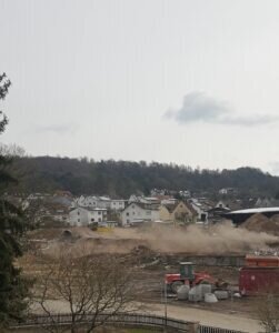 Das Problem ist ausgestanden- auch das ist im doppelten Sinne zu verstehen. Nach 90 Jahren war nicht nur der erfüllte Zweck nicht mehr gegeben, auch an der Standfestigkeit wurde gezweifelt. Zudem war er dem für Siedlungszwecken ausgewiesenen Gelände im Wege. Seit einigen Monaten wird abgerissen, aufgefüllt und geebnet. Auch mit den geplanten Neubauten geht es voran- ein neues Wohngebiet ist „im Werden“.