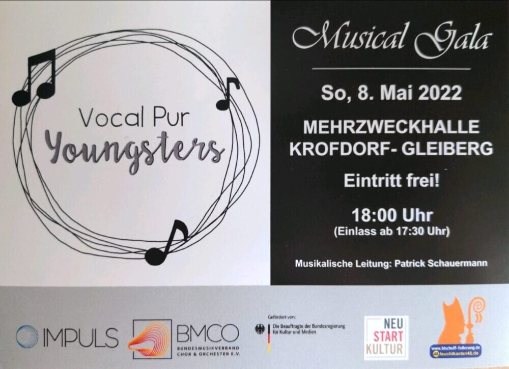Die Musical Gala findet am 8. Mai 2022 in der Mehrzweckhalle in Krofdorf statt. Der Eintritt ist frei, Beginn ist um 18 Uhr, über Spenden für die gemeinsame Chorarbeit freuen wir uns sehr.