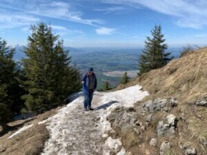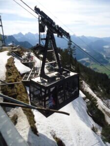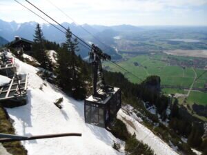 Obwohl ich im Allgäu insgesamt gut bewandert bin, habe ich den Tegelberg wegen des generellen Besucherandrangs stets gemieden. Am Ostersonntag wollte ich’s denn doch mit meinem familiären Besuch mal in Angriff nehmen. Gegen 11 Uhr auf dem Parkplatz der Bahn, gab es da noch viele leere Plätze. Anders bei der Tegelbergbahn selbst. Ich sah ja nicht auf die Uhr, aber eine Dreiviertelstunde dauerte es, bis wir in die Gondel steigen konnten. Vor uns in der Warteschlange fesselte eine – offensichtlich – Sportvereinsgruppe aus Estland (erkenntlich an der Mailadresse auf ihren Jackenrücken) unsere Aufmerksamkeit. Sie sprachen eindeutig russisch. Dann gings in die Gondel. Zusammengepackt wie die Ölsardinen in der Dose, aber mit FFP2-Maske.