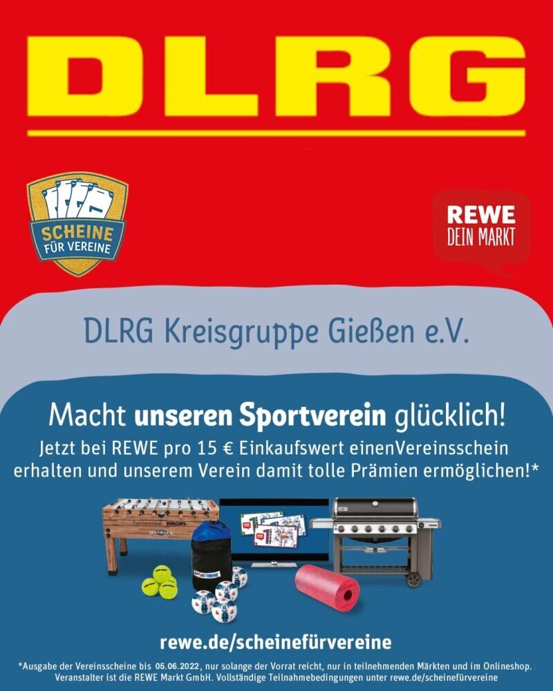Bis zum 05.06.2022 (Pfingsten) kann man fleißig Scheine für unseren Verein sammeln. Wer für mehr als 15,- € bei REWE – vor Ort oder auch online – einkauft, sollte sich einen oder mehrere Vereinsscheine geben lassen. Diese „Scheine“ dann bitte uns, der DLRG Kreisgruppe Gießen, zukommen lassen – zum Beispiel per Post oder Einwurf in den Briefkasten an unserem Vereinsheim (Adresse: Uferweg 4, 35398 Gießen), – oder aber auf der REWE-Aktionsseite direkt unseren Verein zuordnen.
