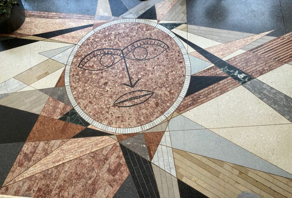 Täglich wird dieses Kunstwerk im wahrsten Sinne des Wortes mit Füßen getreten – denn es befindet sich auf dem Boden des Verwaltungsgebäudes des Landgraf-Ludwigs-Gymnasiums in der Reichenberger Straße in Gießen. Wie viele Schülerinnen und Schüler oder Besucher der Schule wohl darüber hinweggehen, ohne es wirklich wahrzunehmen? Dabei ist es eigentlich nicht zu übersehen und von der Empore aus hat man einen guten Blick darauf. Der Künstler Bernhard Krimmel aus Darmstadt (1926 bis 2020) wurde vor 60 Jahren beauftragt, ein Mosaik im Schulfoyer zu gestalten. In dieser Zeit gestaltete er auch ein Glasmosaik in der Ricarda-Huch-Schule und war künstlerisch im Uniklinikum tätig. In den 50er und 60er Jahren hat Krimmel viel für Schulen, Kindergärten und Kinderkliniken gearbeitet. Krimmel wurde 1965 zum städtischen Kulturreferent der Stadt Darmstadt berufen, war ab 1972 Leiter des Stadtmuseums Darmstadt und seit 1975 Direktor des Instituts Mathildenhöhe. 1980 erhielt er das Bundesverdienstkreuz. Das Fußbodenmosaik im LLG gehört als Kunstwerk zum Schulalltag und ist (trotzdem?) noch in einem sehr guten Zustand.