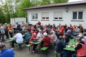 Die erste Maifeier nach zweijähriger „Feierabstinenz“ wegen Corona war eröffnet. Der Besucherandrang bei strahlendem Sonnenschein erforderte die Aufstellung weiterer Festzeltgarnituren auf der Wiese des Ausbildungszentrum des Musikzuges .