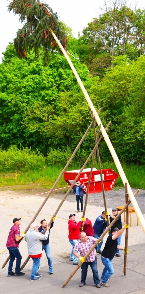 Seit 1997 wird bei dieser Feier ein Maibaum vom VW-Club Holzheim unter musikalischer Begleitung des Musikzuges aufgestellt. in diesem Jahrl wurde diese Muskelkraft zehrende Tradition mit „kleinem Jubiläum“ am 1. Mai, 25 Jahre alt. Applaus gab es für die starken Männer des VW-Club, als der Maibaum nach erfolgreicher Hubaktion senkrecht stehend im Boden verkeilt war.