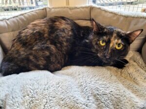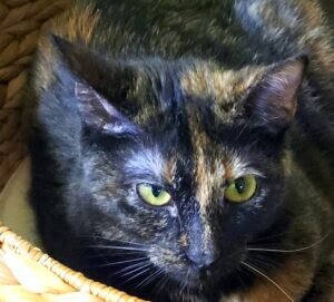 Katze Paulinchen ist ca. ein Jahr alt. Sie ist eine ganz Hübsche mit ihrem aparten “Schildpattmantel” und den großen Kulleraugen. Sie braucht ein bißchen Zeit, bis sie den Menschen vertraut. Hat sie die Zweibeiner einmal in ihr kleines Katzenherz geschlossen, mutiert sie zur großen Schmuserin. Hilft der Mensch mit Leckerchen, ist der Bann schnell gebrochen.