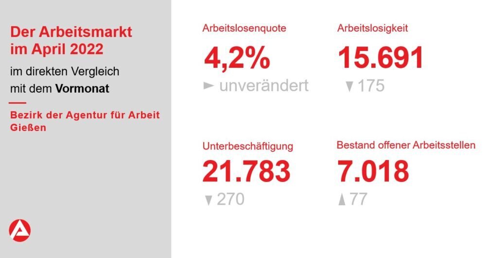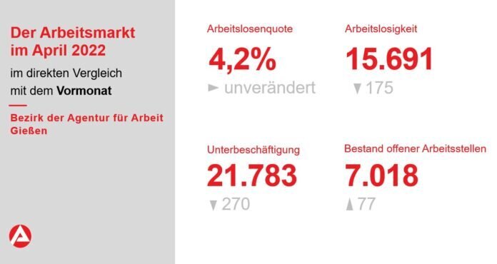Bei der Arbeitsagentur Gießen (und den Geschäftsstellen in Bad Vilbel, Büdingen, Friedberg und Lauterbach) waren im April 5578 Personen gemeldet, 181 weniger im Vergleich zum Vormonat März. Im April 2021 waren 1755 Personen oder 23,9 Prozent mehr registriert.