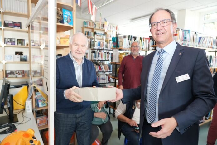 Der Regierungspräsident kam selbstverständlich nicht mit leeren Händen. Für den Bestand der Bücherei gab es neue Sachbücher rund um das Friedensprojekt Europa und die Europäische Union und für die Schülerinnen und Schüler gab es altersgerechte Broschüren.