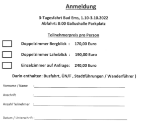 Die diesjährige 3-Tages-Fahrt des VHC Grünberg führt Sie nach Bad Ems, dem Weltbad an der Lahn. Wir heißen Sie willkommen in der Kaiserzeit. Treten Sie ein und wandeln Sie auf historischen Spuren, flanieren Sie durch die Geschichte!