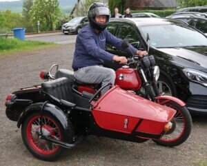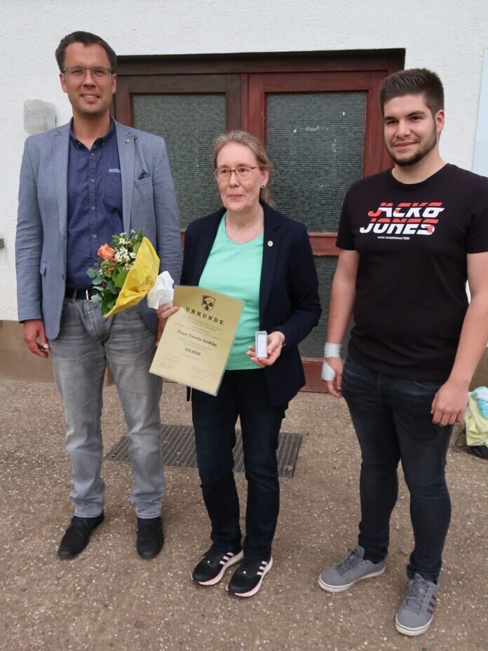 Florian Langecker betonte, dass der jährliche Sportabzeichen Erwerb von Carola Sodtke seit Erreichen des 40. Lebensjahres jedes Jahr eine Herausforderung ist, ihre Fitness zu beweisen und sie mit Stolz das Abzeichen nun in Bicolor mit Zahl 15 tragen kann. Ihre Beständigkeit wurde gelobt, sie ist ein Vorbild. Vorbildlich auch für ihn, da er selbst erst bei drei Sportabzeichen angekommen ist, aber das „vierte Mal in Arbeit“ ist, so betonte er seine Absichten. Florian Langecker`s sportliche Ambitionen liegen mit Radfahren und Joggen im heimischen Bereich. Eine sportliche Note gab er der Anreise zum Sportplatz mit seinem Gefährt- ein Oldie-Motorrad mit Beiwagen. Den Glückwünschen schloss sich J. B. Hausner an, der einen Blumenstrauß überreichte. Für den Sportabzeichen-Treff gratulierte Nicole Rabenau.