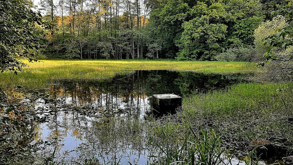 Unser Zwischenziel, Marcksche Teiche.  Jürgen Becker konnte vom Laubfrosch-Vorkommen, sowie von brütenden Zwergtauchern berichten, die er bei früheren Begehungen beobachtet hatte.  Aktuell wird davon nichts mehr registriert, außer zwei Stockenten-Paare.  Der Ruf des Kuckucks war weithin zu hören.
