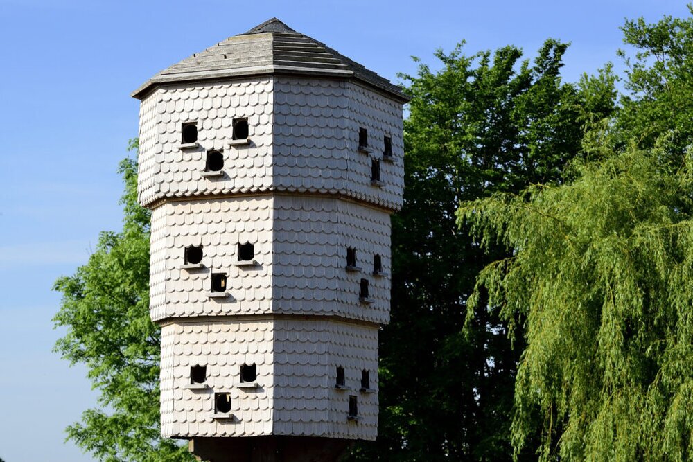 Oberhalb des Mühlenwegs: Dreistöckiges Taubenhaus – leicht überbaut auf Sechskant-Ständer mit Knaggen.