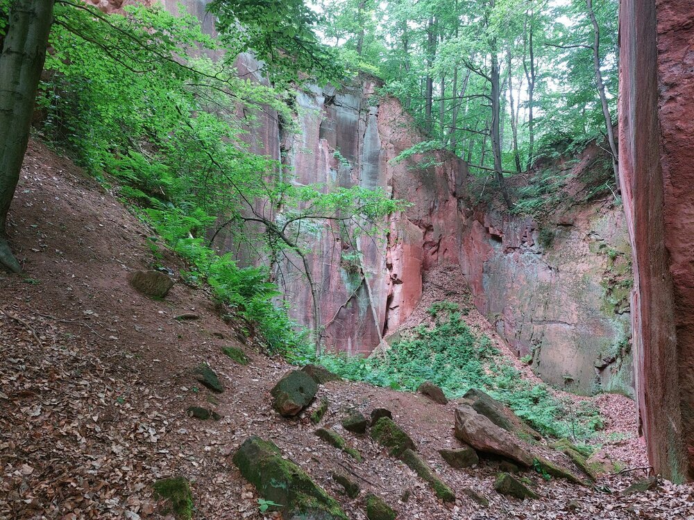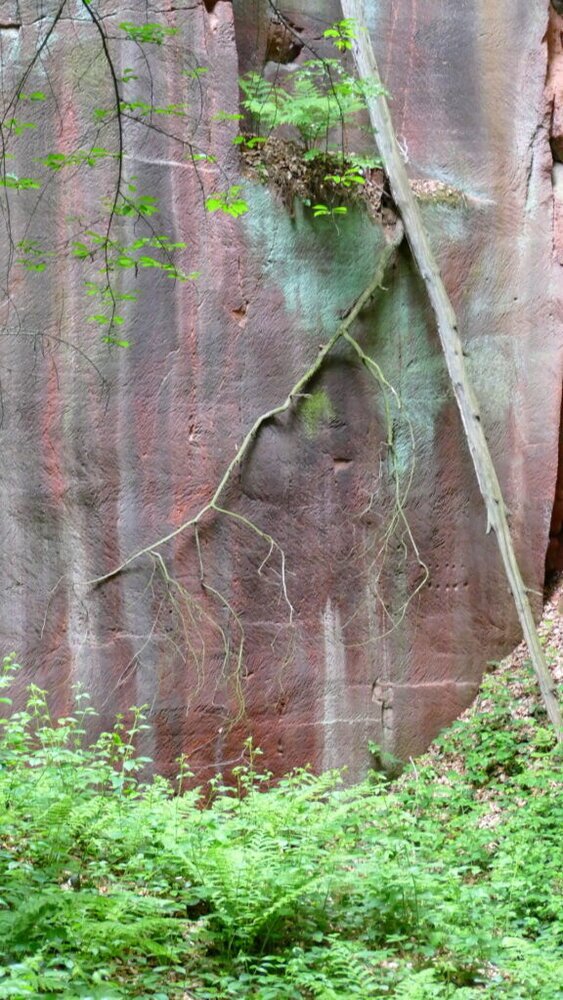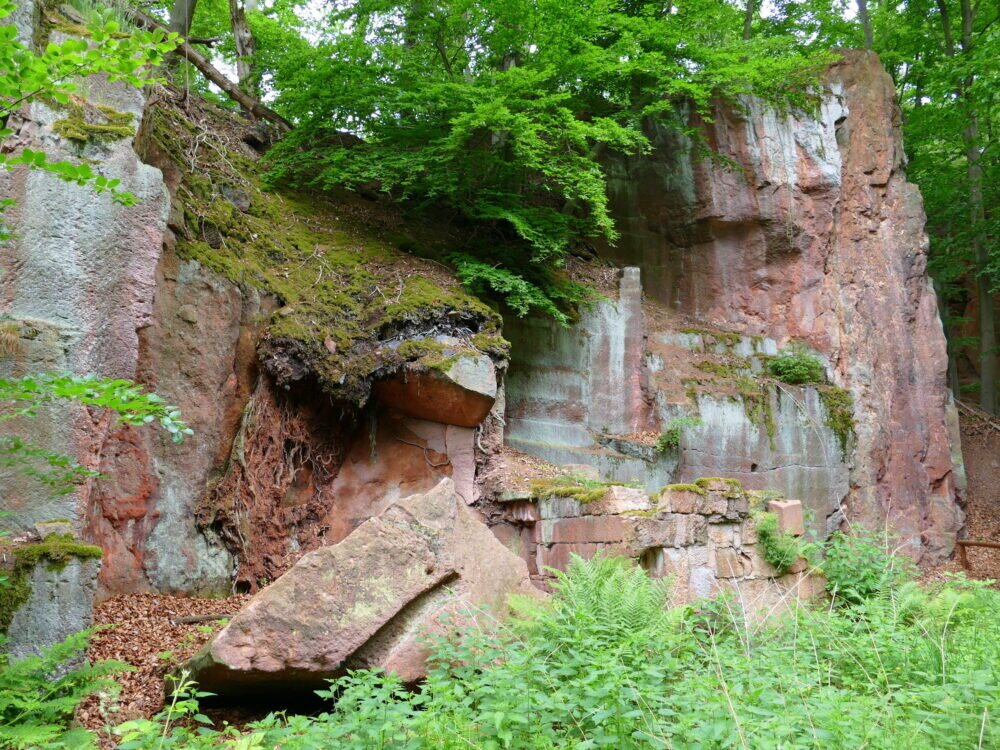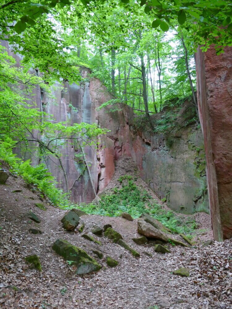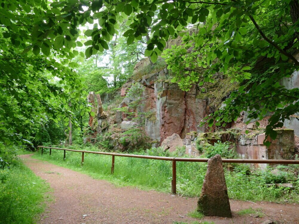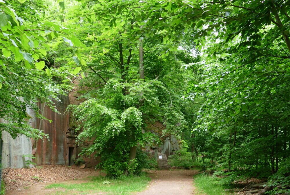 Man kann in den aufgegebenen Steinbrüchen herumlaufen in den dafür angelegten Wegen. Die Natur hat sich den freigelegten Stein schon wieder erobert mit Bewuchs von Moosen und Bäumen.