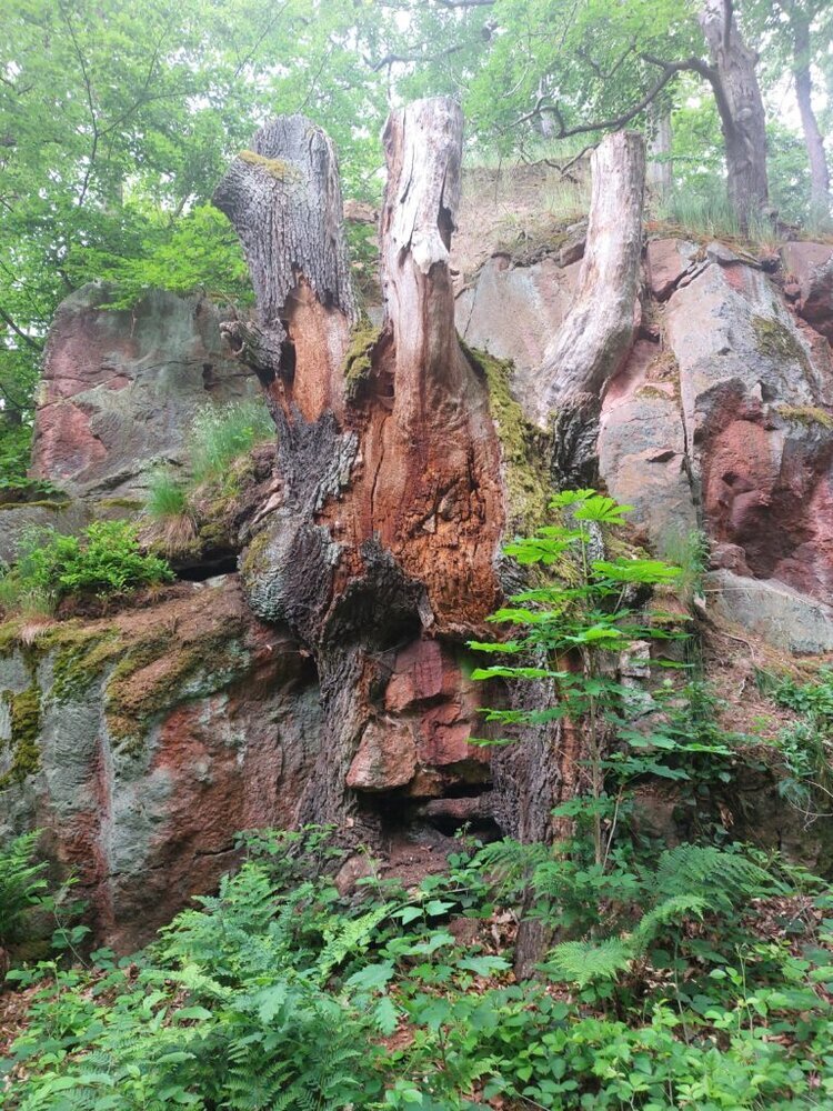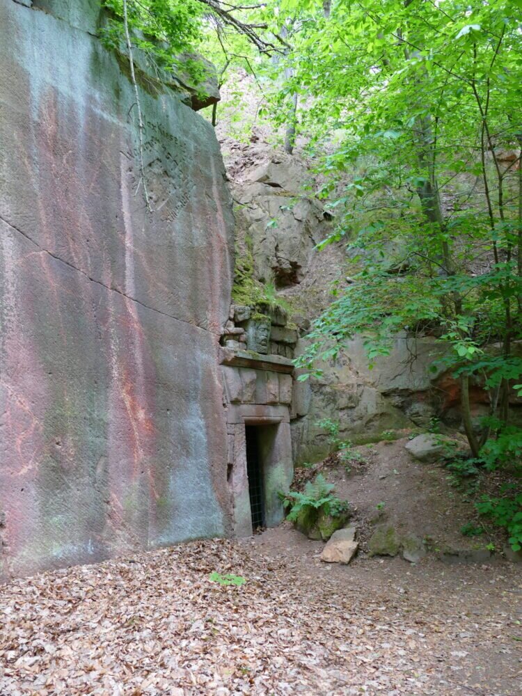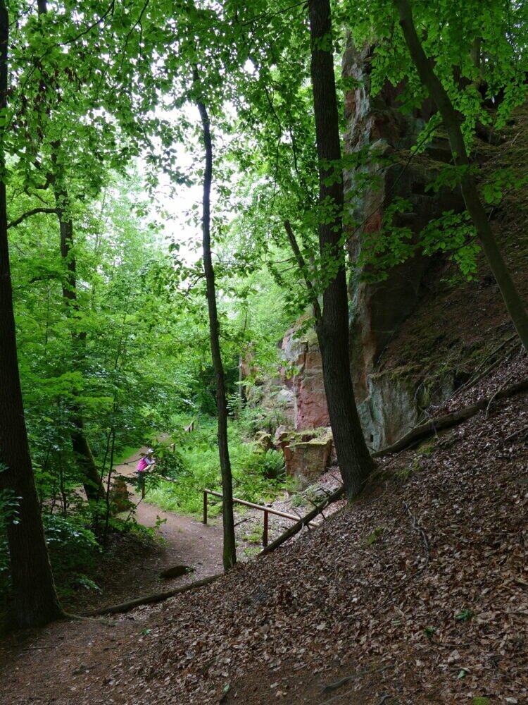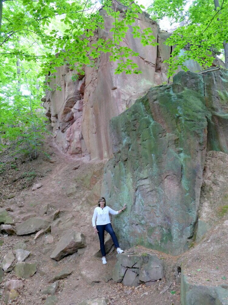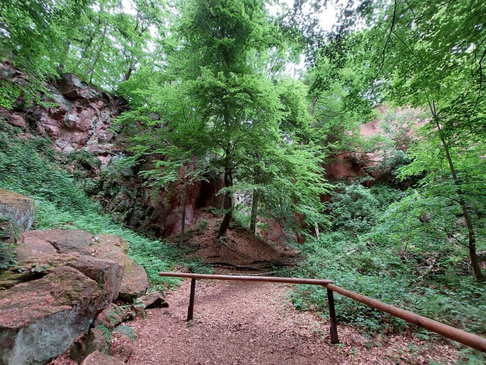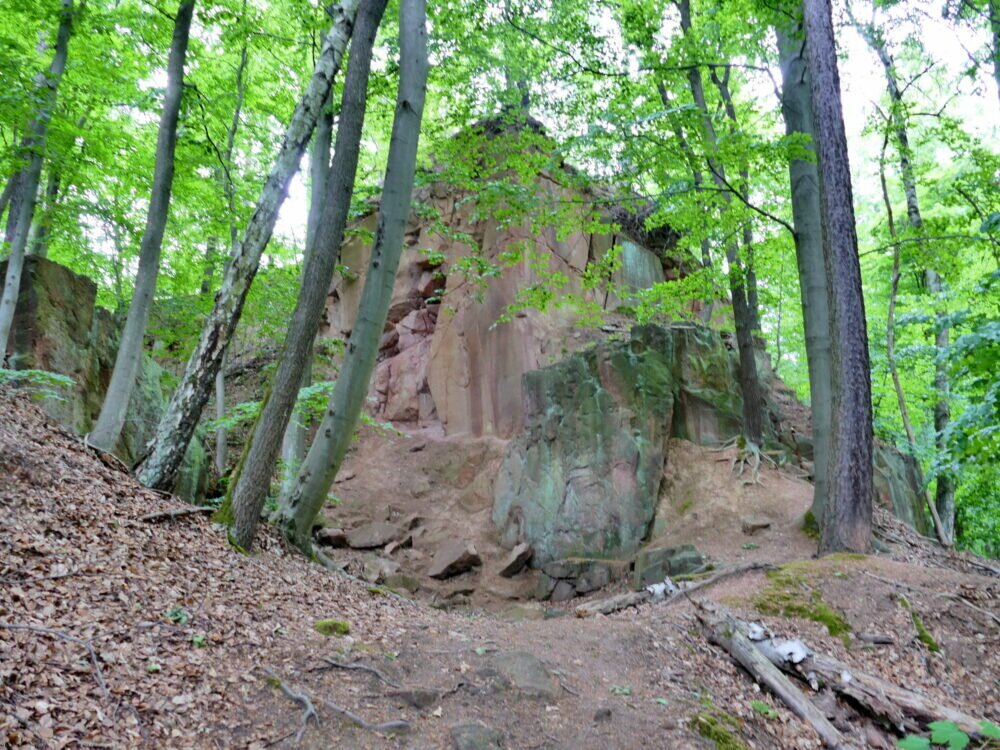 Man kann in den aufgegebenen Steinbrüchen herumlaufen in den dafür angelegten Wegen. Die Natur hat sich den freigelegten Stein schon wieder erobert mit Bewuchs von Moosen und Bäumen.