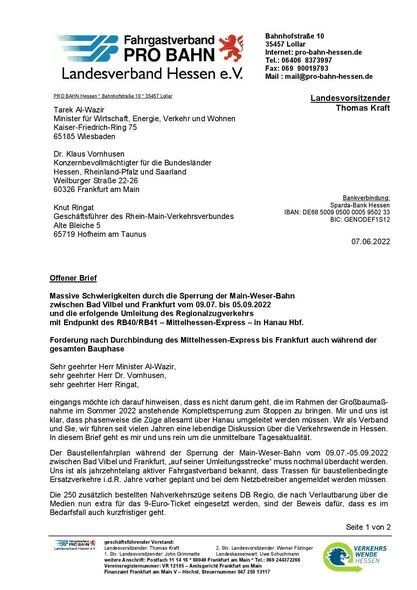 Wegen des drohenden Fiaskos auf der Main-Weser-Bahn wegen der Vollsperrung zwischen Bad Vilbel und Frankfurt im Sommer 2022 und der Umleitung des Mittelhessen-Express lediglich nach Hanau, hat der PRO BAHN Landesvorsitzende Thomas Kraft einen “offenen Brief” an den Hessischen Verkehrsminister Al-Wazir, an den RNV-Geschäftsführer Ringat und an den DB-Konzernbevollmächtigten Dr. Vornhusen geschrieben.