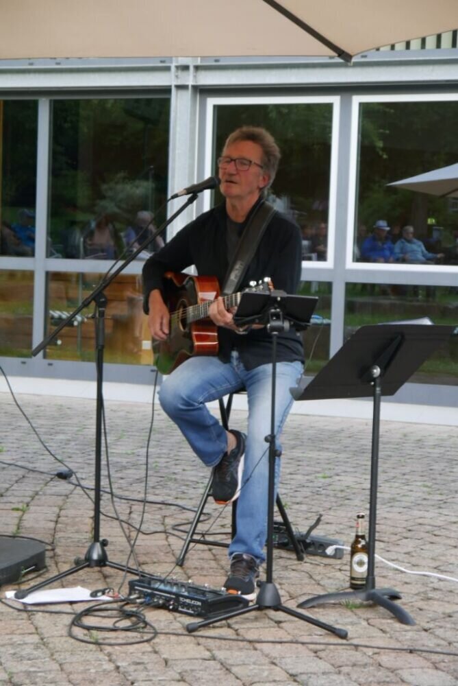 Im dritten Anlauf hat’s geklappt! Zwei Mal musste das Konzert in der Vergangenheit schon wetterbedingt ausfallen – diesmal erwies sich der skeptische Blick zum Himmel noch beim Aufbauen am Nachmittag aber als unbegründet. So konnte Ulli Nass bei Sonnenschein und guter Laune um 18 Uhr sein Konzert für die zahlreichen Gäste starten. Mit humorvollen und informativen Erläuterungen zu den vorgetragenen Songs war von Anfang an gute Stimmung garantiert im wunderbaren Ambiente des Parks.
