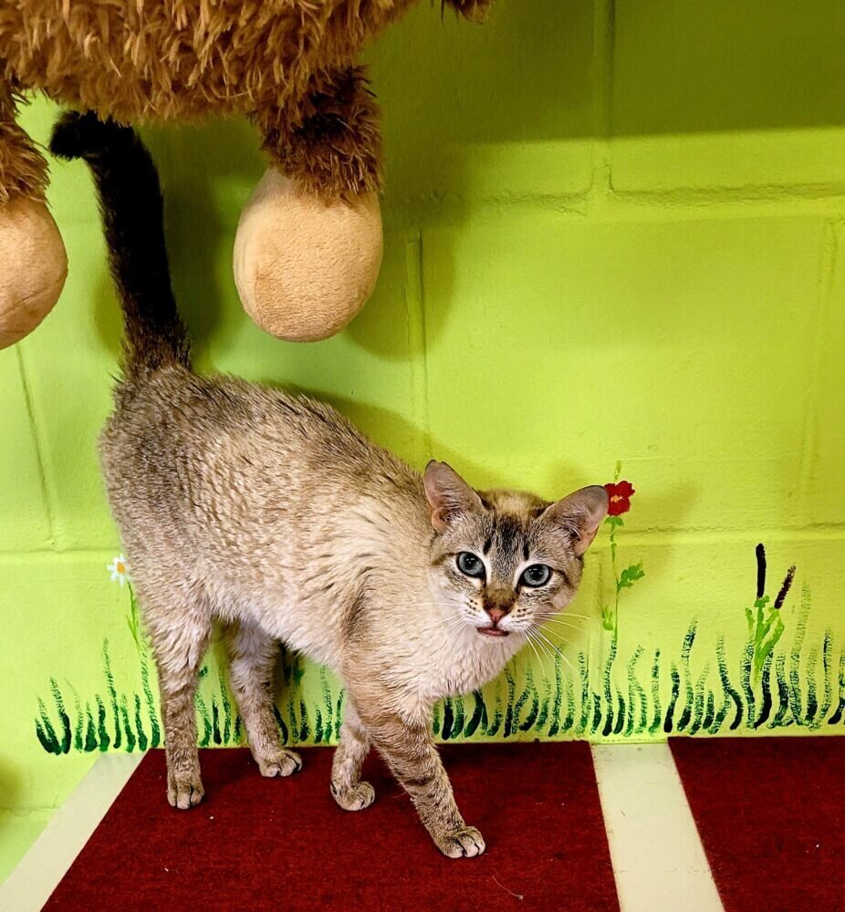 Sie bekommt jetzt von uns kalorienreiches Futter und Aufbaukost. Das schlabbert sie und verlangt es mit typischem Siamgemaunze.
