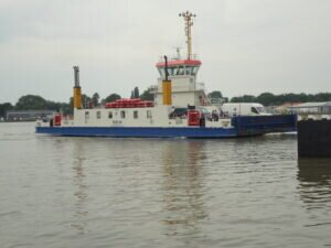 einen der niedrigeren rot-weißen Leuchttürme mit dem “Unterfeuer” und in gebührendem Abstand die höheren “Oberfeuer”. Beide Lichtsignale müssen von der Brücke der Schiffe aus in einer Linie stehen, wenn der Kurs stimmen soll. Und natürlich grasen auf Schritt und Tritt die “Deichmähmaschinen”, die Schafe.