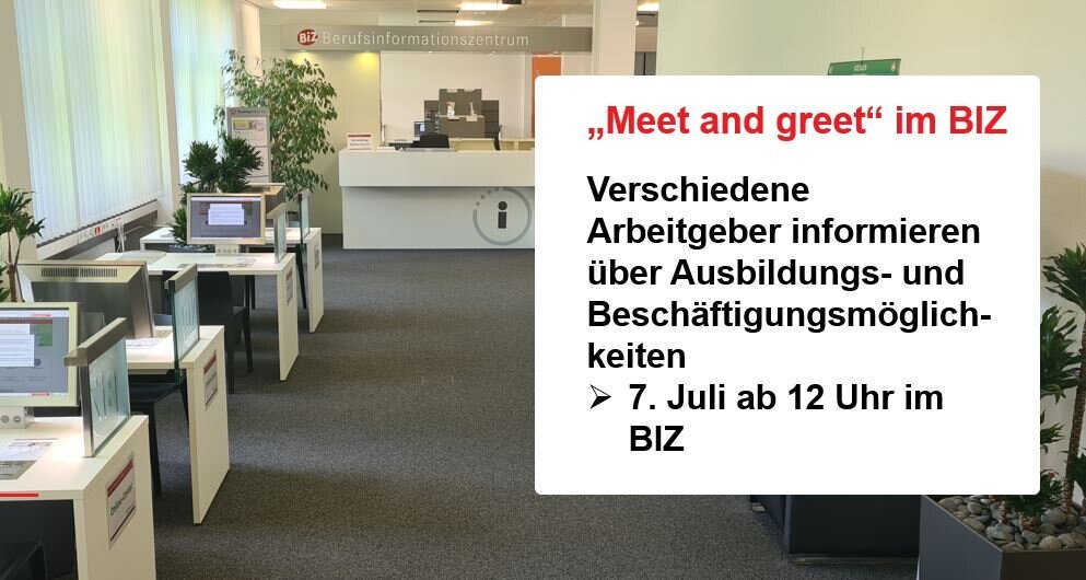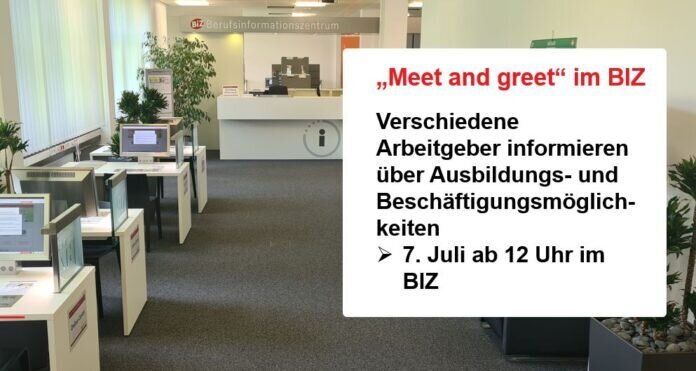 Unter dem Motto „meet an greet“ bietet das Berufsinformationszentrum (BiZ) der Arbeitsagentur Gießen am Donnerstag, 7. Juli von 12 bis 17 Uhr die Möglichkeit, direkt und unkompliziert Kontakt mit Arbeitgebern der Region aufzunehmen.