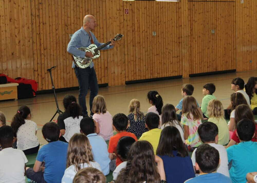 „Wer hat sie geseh´n?“ – kaum hat Oliver Steller die ersten Takte seines Liedes „Die Spinne Martha“ gespielt und gesungen, da singen die Kinder der Hedwig-Burgheim-Schule und die Vorschulkinder der Kita Rödgen schon lauthals mit. Oliver Steller ist auf Einladung des Fördervereins der Schule mit Frieda (seiner Gitarre) in die Turnhalle der Grundschule gekommen. Schnell fesselt der Musiker die Kinder mit seinen Gedichtinterpretationen und frechen Liedern. Immer wieder lädt er die Kinder zum Mitsingen, Mitsprechen und Mitklatschen ein. Sogar einen Zaubertrick hat er mitgebracht. Und natürlich dürfen die Zungenbrecher nicht fehlen, bei dem sich die Kinder fast die Zungen verknoten und Oliver Steller dazu auffordern, den „Zungenverfitzler“ immer schneller zu sprechen. Dazu nimmt er sogar Anlauf! Gedichte von Theodor Fontane oder Bertolt Brecht wurden vorher noch nie so eindrucksvoll vorgetragen. Sie prägen sich ein und bleiben hängen. Und beim Lied „Mein ungezog´ner Opa“ amüsieren sich alle über den Opa, der die Zunge rausstreckt und in der Nase popelt. Am Ende des Konzertes gab es einen langen Applaus und ein Plakat, welches die Kinder als Dankeschön für den Künstler gestaltet hatten. Schulleiterin Nina Schäfer bedankte sich bei Oliver Steller für das außergewöhnliche Konzert und beim Förderverein der Grundschule für den großzügigen Zuschuss, der auch mit Hilfe einer Spende der AWO Ortsgruppe Rödgen finanziert wurde.