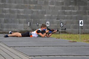 Auch in der Herren I – Klasse war Laubach durch zwei Starter vertreten: Marc Bastiné leistete sich zwar zu viele Schießfehler, war läuferisch aber so gut, dass er sich Platz 6 und das Ticket für die DM holen konnte. Die Herren-Konkurrenz war ebenso hochklassig wie die der Damen, lief Mark Sippel vom SV Stärklos hier eine hervorragende Zeit von 14:34 min. bei einem Schießfehler. Ihm folgte auf Rang zwei ein weiterer Hesse, Max Hubel vom SV Mademühlen. Auch er hat schon Erfolge auf internationalen Wettkämpfen zu verzeichnen. Der zweite Laubacher Sommerbiathlet in der Herren I – Klasse leistete sich einen Schießfehler zu viel für die Qualifikation zur DM und blieb knapp hinter dem Limit.