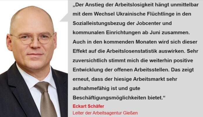 „Die derzeitige Veränderung am Arbeitsmarkt, die mit einem Anstieg der Arbeitslosigkeit einhergehen, hängt unmittelbar mit einer Neuregelung ab Juni zusammen. Ukrainische Flüchtlinge, die bislang Geld nach dem Asylbewerberleistungsgesetz erhalten haben, wechseln in den Sozialleistungsbezug der Jobcenter und kommunalen Einrichtungen. Auch in den kommenden Monaten wird sich dieser Effekt auf die Arbeitslosenstatistik auswirken“, kommentiert Eckart Schäfer, Vorsitzender der Geschäftsführung der Arbeitsagentur Gießen. „Sehr zuversichtlich stimmt mich die weiterhin positive Entwicklung der offenen Arbeitsstellen. Das zeigt erneut, dass der hiesige Arbeitsmarkt sehr aufnahmefähig ist und gute Beschäftigungsmöglichkeiten bietet.“