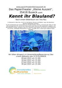 Aber damit nicht genug. An jedem Samstag im Juli, jeweils um 15 Uhr, spielen wir „Kennt ihr Blauland?“ in unserem Theaterraum im ehemaligen Cafe Albert in Großen Buseck. Das Stück ist für Kinder ab 3 Jahre geeignet. Anmeldungen sind über unsere Homepage erwünscht.
