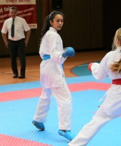 Leano Kabisch war zum ersten Mal bei der Deutschen Karate Meisterschaft. Er eröffnete den Wettkampf mit der Kata Goju Shiho Sho. Nach anfänglicher Nervosität fand er sicher in den Kampf und zeigte eine starke Leistung, die mit einer hohen Wertung belohnt wurde. Am Ende fehlten nur 0,4 Punkte für das Erreichen des Halbfinales. Am Mittag startete Samim Swirchewsky hochmotiviert im Kumite, verlor aber in der zweiten Runde mit 0:2 Punkten gegen den späteren Deutschen Meister, so dass er sich in der Trostrunde noch einen guten 9. Platz erkämpfen konnte. Im Kumite der Mädchen zeigte Davary Phok gleich in den ersten