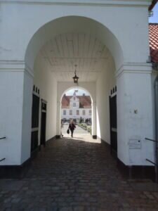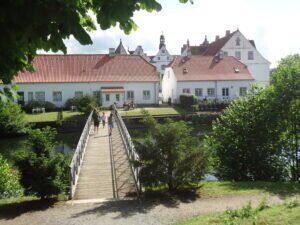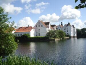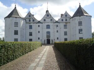 Wie immer, findet man im Worldwide Web, vor allem in wikipedia, viel Interessantes über den Bau. Daher will ich mich hier kurz halten. Der Vertrag zum Bau des Schlosses wurde 1582 geschlossen. Es steht auf einem Granitsockel im Wasser und wurde aus Backsteinziegeln hochgezogen, die weiß verputzt wurden. Die Ziegel stammten großteils aus dem an dieser Stelle zuvor seit 1192 bestehenden Kloster. Der Besitz wechselte oft zwischen dänischen und schleswigschen Herren, oft waren sie durch Personalunion beides zugleich.
