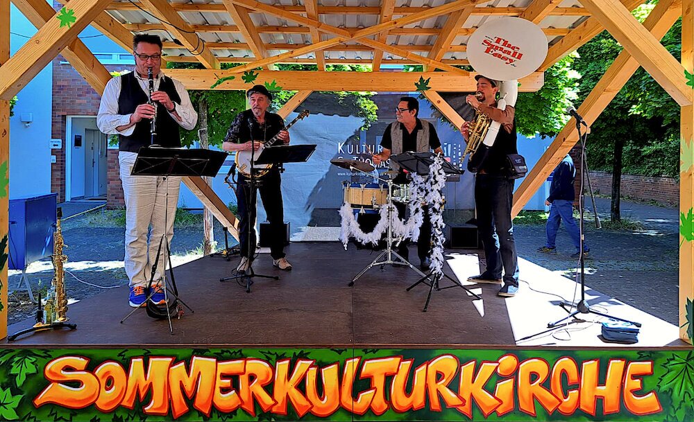 Am vergangenen Sonntag lud der Förderverein der Kulturkirche St. Thomas Morus zum ersten Jazz-Frühschoppen ein. Zu Gast war „The Small Easy“. Die Band um Stefan Koch (Clarinet), J.J. Fischer (Banjo, Gesang), Andreas Jamin (Sousaphone) und Joe Bonica (Drums) lässt das New Orleans der Jahre 1900 bis 1950 wieder aufleben. Im „Big Easy“, dem einzigartigen Schmelztiegel des amerikanischen Südens, entstand im Zusammenwirken von afrikanischen, französischen, indianischen und karibischen Einflüssen die Urform des Jazz.