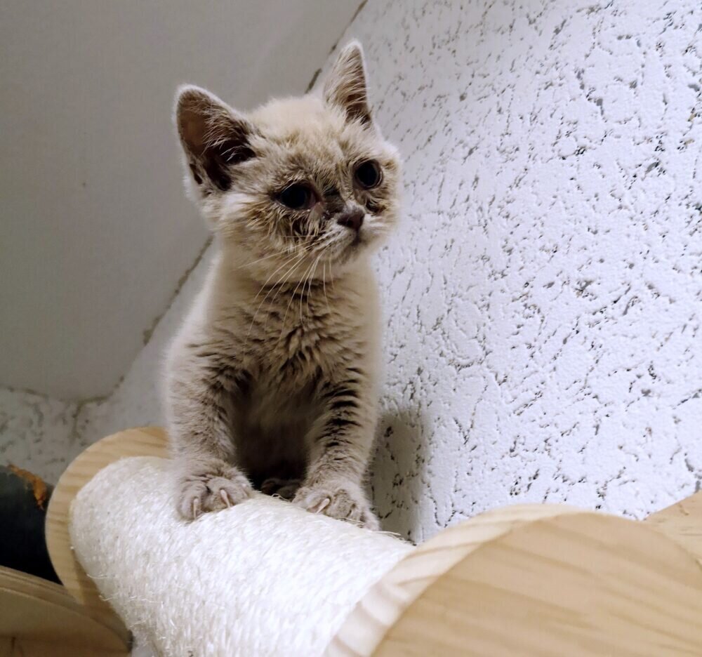 Das Kitten war ca. 5 Wochen alt, als es mehr tot als lebendig gefunden wurde. Haut und Knochen, schmutzig, mit verklebten Augen kauerte es in einem Karton. Es wurde sofort in der Praxis unserer Tierärztin vorgestellt und mit allen notwendigen Medikamenten und Flüssigkeit versorgt. Erstaunlich schnell erholte es sich und mobilisierte alle Lebenskräfte. Es bekam Kittennahrung, welches es gierig verschlang. Aber vorher biss es unsere Tierärztin noch schnell in den Finger! 😉 Wir haben es Crumpy getauft. Auf unserer Pflegestelle lebt es mit anderen Kitten zusammen und hat die “Führungsrolle” übernommen! Es ist ein zuckersüßes, freches kleines Ding ! Es sieht aus wie ein British Shorthair!