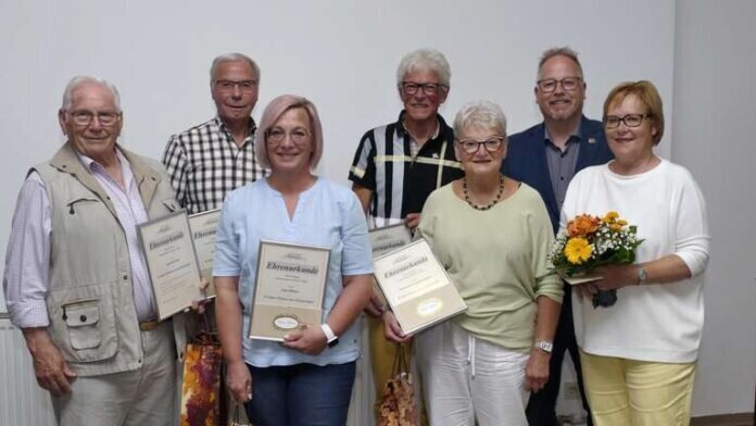 Foto von links: Karlfried Lauz (65 Jahre förderndes Mitglied) Dieter Schwalm (40 Jahre aktiv) Anja Büttner (25 Jahre Mitglied) Dieter Kujawski(25 Jahre aktiv) Thorlinde Drommershausen (40 Jahre Mitglied), Mike Mülich (Vorstandsteam), Ute Pohl (Verabschiedung aus dem Vorstandsteam) Foto: Volker Mattern